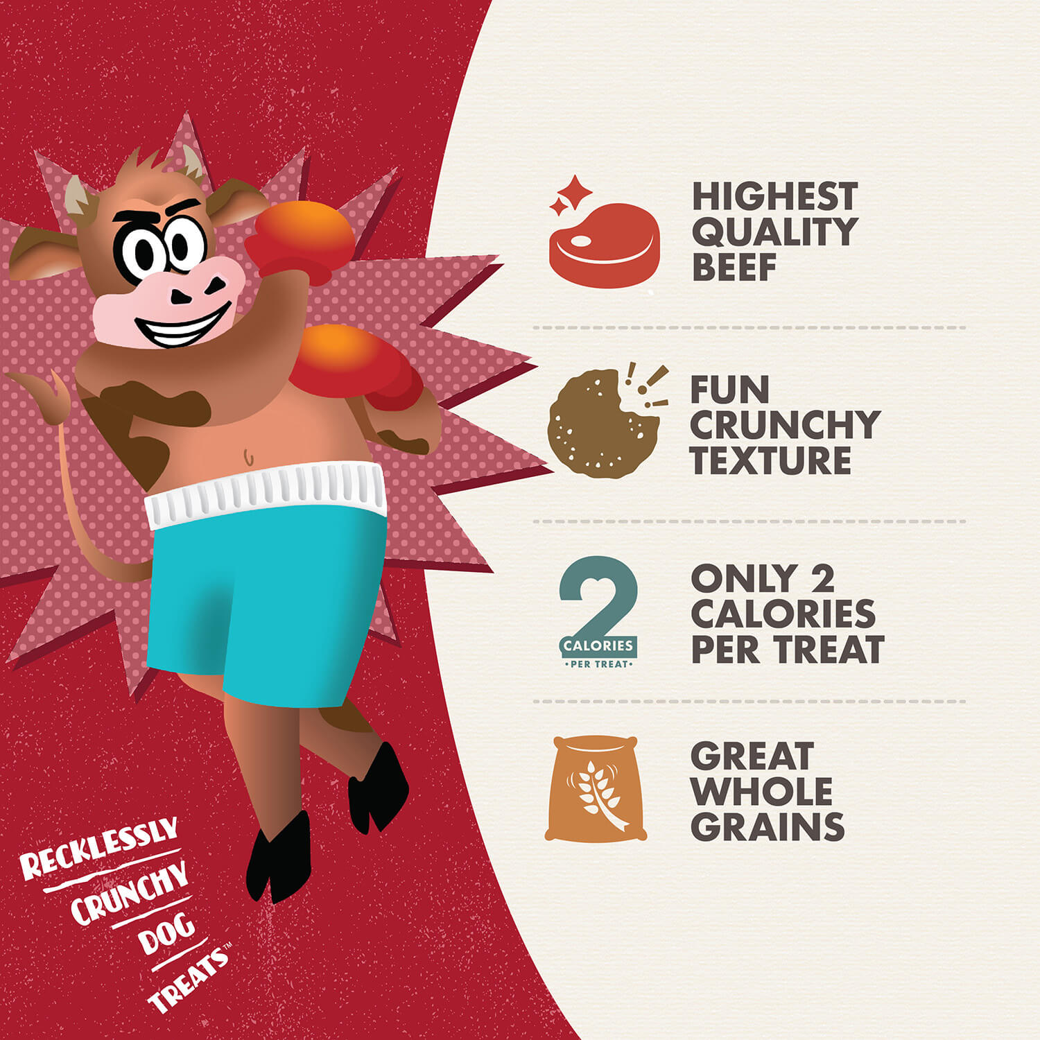 Wanna pack a punch? Combine beef, oats, potatoes, and veggies for a flavor smackdown. Here at Fromm, we're making a great dog treat that’s delicious, wholesome, and recklessly crunchy. When our Dangerous Duke Wellington hits the ring, he is not pulling punches. Delivering a TKO of savory flavor, and an uppercut of crunchiness, your dog will be begging for more. Let your dog create a crunchy ruckus that will leave the other pups feeling like lightweights.